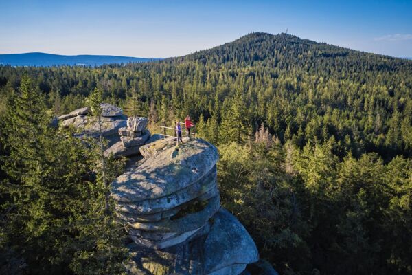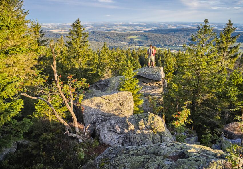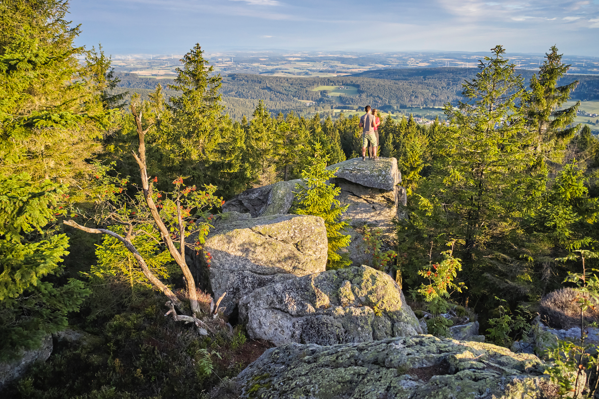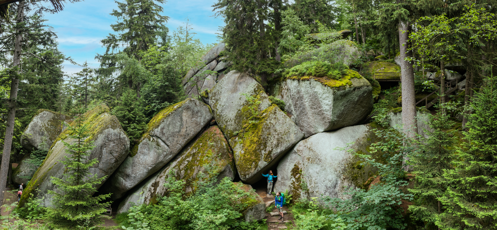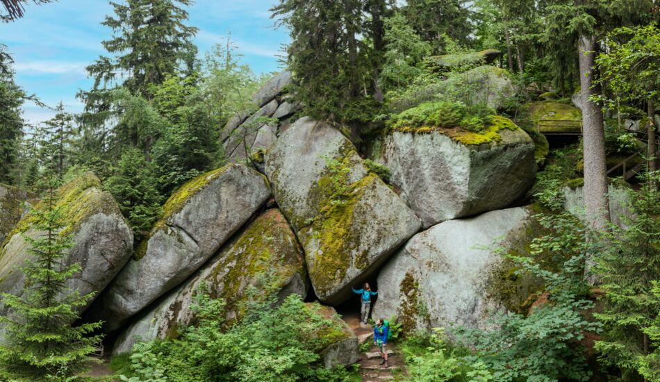 Aktiv werden kann man bei der nächsten Station: Der Bürgerliche Landschaftsgarten nahe der Festspielstadt Wunsiedel ist ein nationales Geotop und geprägt vom Felsenlabyrinth Luisenburg. Man läuft zwischen gigantischen Granitblöcken, engen Felsspalten und kleinen Schluchten, ersteigt die „Teufelstreppe“ und staunt über die beeindruckenden Landschaftspanoramen an den Aussichtspunkten.